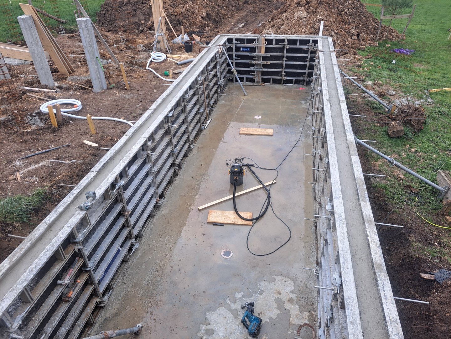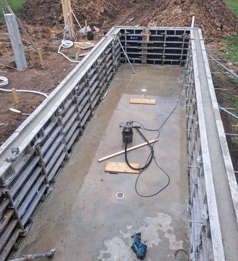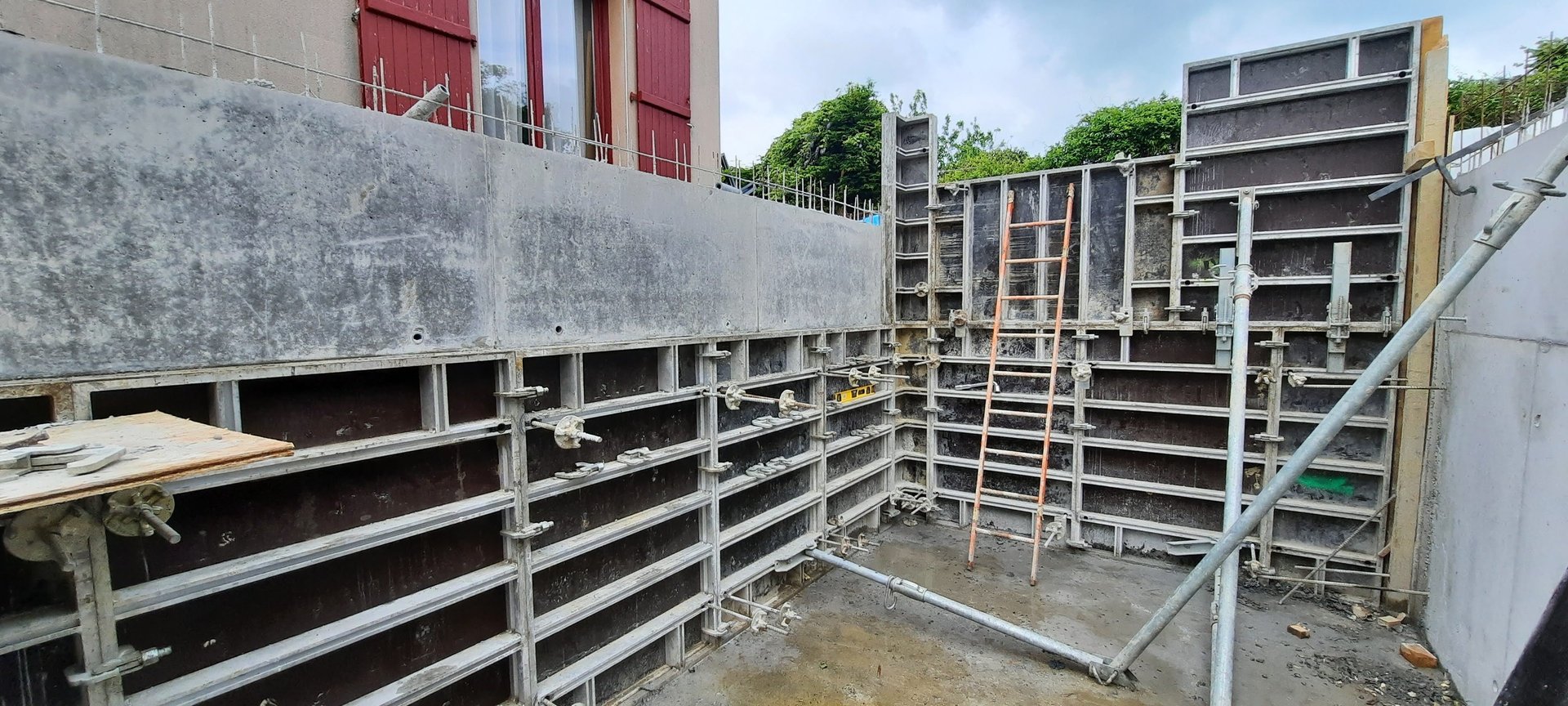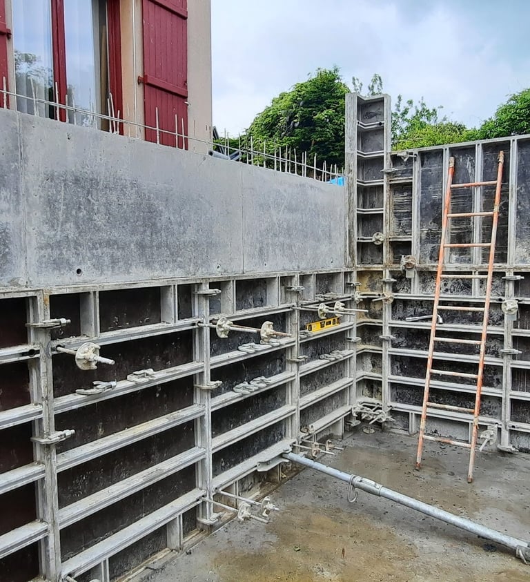Réalisation d'une piscine en béton armé et de fondations pour une maison en ossature bois.